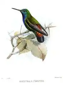 The flame-rumped sapphire (Hylocharis pyropygia) is a doubtfully valid species of hummingbird in the family Trochilidae known only from Brazil. Today few authorities accept it as valid, instead believing it represents a hybrid between Chlorostilbon lucidus and Hylocharis cyanus.