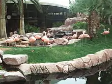 The garden courtyard houses a wildlife habitat featuring Chilean flamingos, Ringed Teal ducks, and other birds. There are also koi fish and turtles.[23] It was the home of penguins, but they have since been moved to the Dallas Zoo.[24] Extending the hotel's tropical theme, a Jimmy Buffett's Margaritaville restaurant and gift shop was opened in December 2003.[25] An adjacent Margaritaville "minicasino" opened in October 2011.[26]
