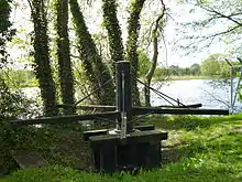 As navigation increased in importance, improvements were made to the basic design, and they came to be known by various names according to where they were located. Thus on the Thames they were called navigation weirs, on the East Anglian rivers they were called staunches, those on the River Avon, Warwickshire were called water gates, and in a number of instances they were called half locks. On the River Nene and some of the tributaries of the River Great Ouse, a design using a guillotine gate in a wooden frame was used from the early seventeenth century onwards. The gate was opened by operating a large spoked wheel, connected by chains to a toothed drum.[6]