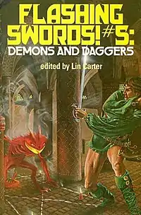 Flashing Swords! #5: Demons and Daggers is an American anthology of fantasy stories, edited by American writer Lin Carter. It was first published in hardcover by Nelson Doubleday in December 1981 as a selection in its Science Fiction Book Club, and in paperback by Dell Books simultaneously.[1]