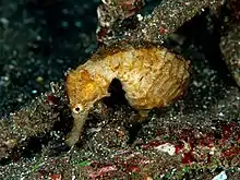 The longnose seahorse (Hippocampus trimaculatus), also known as the flat-faced seahorse, the low-crowned seahorse, and the three-spot seahorse, is primarily found in shallow seas around Australia and Asia. Its diet consists of plankton and small crustaceans that get sucked in through its snout. This species likes to anchor itself to sea grass while feeding in order to save energy, which is another typical seahorse behavior. Though its appearance can vary, it typically is flat, with a sharp, hook-like cheek and eye spines, with a narrow head and no nose spines. Its color can be golden orange, sandy colored, or even totally black. Some are known to have brown and white zebra-like stripes. In addition, the males are known to be slightly longer on average than females.[4]
