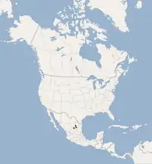This bat is endemic to Mexico where it is restricted to a small area in the states of Coahuila, Nuevo León and Zacatecas in the Sierra Madre Oriental range in the northeast of the country.[1] It occurs at altitudes between 2,100 and 3,200 m (6,900 and 10,500 ft) and its total range is probably smaller than 20,000 km2 (7,700 sq mi). It has specific habitat requirements, being confined to montane forests with Yucca and pinyon pine.[1]