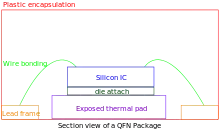 The figure shows the cross section of a flat no-lead package with a lead frame and wire bonding. There are two types of body designs, punch singulation and saw singulation.[3] Saw singulation cuts a large set of packages in parts. In punch singulation, a single package is moulded into shape. The cross section shows a saw-singulated body with an attached thermal head pad. The lead frame is made of copper alloy and a thermally conductive adhesive is used for attaching the silicon die to the thermal pad. The silicon die is electrically connected to the lead frame by 1–2 thou diameter gold wires.