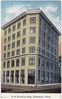The Hamilton Building also known as The Flatiron Building of Bellingham was the first "skyscraper" in Bellingham. Built in 1908 for Talifero Simpson Hamilton's growing Bellingham Bay (B.B.) Furniture Company established in 1889, the building cost $100,000 and used thirty-five thousand barrels of cement along with 200,000 pounds of steel. Due to its triangular shape and resemblance to the Fuller Building in New York, the building instantly garnered the flatiron nickname.[1] It was Bellingham's tallest structure until 1926.