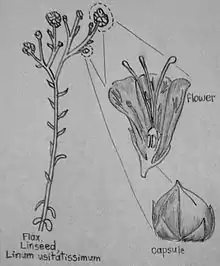 Flaxseed oil is high in alpha linoleic fatty acid (ALA) of which is important to human and animal nutrition.[1] The flaxseed itself can be consumed by the general population. With its short maturation period and self-pollination, the crop can produce multiple cuts of straw and seeds.[3] A versatile crop, flaxseed can be used in breads and cereals as well as oil for supplementation as it is a great source of micronutrients, ALA, and fiber.[7]