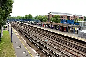Fleet railway station serves the town of Fleet in Hampshire, England. It is situated on the South West Main Line, which has four tracks through the station. There are two platforms on the outer pair of tracks, which are served by trains between London Waterloo and Basingstoke and Southampton. The centre pair of tracks have no platforms and are used by through-services.