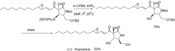 - Barrett, Anthony G. M.; Head, John; Smith, Marie L.; Stock, Nicholas S.; White, A. J. P.; Williams, D. J. (1999). "Fleming−Tamao Oxidation and Masked Hydroxyl Functionality: Total Synthesis of (+)-Pramanicin and Structural Elucidation of the Antifungal Natural Product (−)-Pramanicin". The Journal of Organic Chemistry. 64 (16): 6005–6018. doi:10.1021/jo9905672. ISSN 0022-3263.
