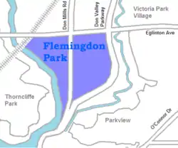Three major roadways pass through Flemingdon Park, including the Don Valley Parkway, a major north-south controlled access highway, and Eglinton Avenue, a major east-west thoroughfare that also marks the neighbourhood's northern boundary. Don Mills Road is another major north-south thoroughfare, that splits the neighbourhood into two halves, with the more developed portion of the neighbourhood to the east, and the ravine system to the west of the roadway.