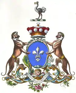 In the United Kingdom, a fleur-de-lis has appeared in the official arms of the Norroy King of Arms for hundreds of years. A silver fleur-de-lis on a blue background is the arms of the Barons Digby.[42]