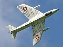 In the autumn of 1994 the Hawker Hunter J-4040 received a special painting for the farewell. The all white aircraft wore the names of the pilots as well as texts Fliegerstaffel 15 in newspaper style, in reference to the symbol of the paper aircraft. The underwing tanks also received this coating. The registration was changed from J-4040 to J-4015 (because of the Fliegerstaffel “15”), although the Luftwaffe operated another Hunter with the registration J-4015 at the same time. The Hunter with the original registration J-4015 was decorated in September 1994 as Graffity Hunter by the Fliegerstaffel 20. The 15 Squadron aircraft was named Papyrus-Hunter. Originally, the "Papyrus Hunter" was to be placed on a pedestal at the entrance to the St. Stephan airfield, but the Hunterverein Obersimmenthal managed to keep the aircraft airworthy to this day with the civilian Aircraft registrationHB -RVS and performing displays airshows.