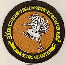 Fliegerstaffel 2 (No. 2 Squadron) was using Hawker Hunter aircraft for the Swiss Air Force at the time of disbandment. Its pilots origined from French-speaking Switzerland and its home was the military airfield of Turtmann then. As a coat of arms, Fliegerstaffel 2 used a white bird taken from the one of Gruyère District on a red background surrounded by a motto saying "En Avant, Advienne Que Pourra". 2ème Escadrille .