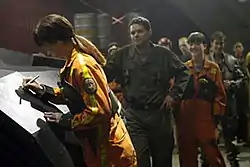 One of the system malfunctions shown on Galactica in "Flight of the Phoenix" is the ship's firing range losing oxygen as Apollo, Starbuck, and Hot Dog practice shooting. According to Moore, the scene was scripted to give the audience a slowly building sense of discomfort. The three characters' differing reactions are based on observations of pilots under induced hypoxia. They save themselves by shooting out the range's window. Actors Jamie Bamber (Apollo) and Katee Sackhoff (Starbuck) came up with the idea that their characters should aim the weapon together.[3]