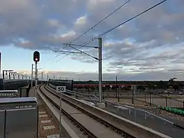 The original Tonsley station was closed after the final service on 28 June 2019, allowing construction of the rail overpass on the station site; services terminated at Clovelly Park station until the extension was completed.[12] Built concurrently with the adjacent Darlington Upgrade for the Southern Expressway,[13][14] major works took place from July 2019 to October 2020.[15][16] The line was temporarily closed after the last service on 20 November 2020 for the extension to be commissioned, and fully reopened on 29 December. Operating hours of the line was expanded to include weekday nights and weekends; previously the line only ran between 6:30 AM and 7:30 PM on weekdays and was closed on weeknights and weekends.[17][18]