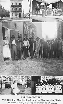 The history of the hospital can be traced to the Phyllis Wheatley Sanitarium and Training School for Negro Nurses, run by the Phyllis Wheatley Club.[1][2][3] The training school included hospital care and was founded in 1896, operating under the administration of the Phyllis Wheatley Club and located in the Medical College facility of New Orleans University, which was run by the Methodist Episcopal Church.[3] Needing increased financing to maintain the hospital and because of a lack of financial support, the school was taken under the wing of New Orleans University and merged with the school's Medical College hospital.[2] The efforts of Methodist Episcopal Church Bishop Willard Francis Mallalieu, the school was able to enlist the aid of John Flint of Fall River, Massachusetts, who donated $25,000 to the institution.[1][3] In 1901, the name of the hospital was changed to Sarah Goodridge Hospital and Nurse Training School and the medical college to the name Flint Medical College of New Orleans University in honor of John Flint.[2][3] Flint donated an additional $10,000 to purchase a new property at 1566 Canal Street, which would house the Flint Medical College.[3]