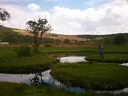 Lake Aksakal, which contains the floating islands, is a crater lake located in Hazarşah village of Solhan district in Bingöl Province. It is 4.5 km (2.8 mi) far from the Bingöl-Muş highway D. 300.[1] The lake is situated on a flat terrain surrounded on three sides by mountains and hills. The lake has freshwater. The water level of the lake remains same in the winter and summer months due to continuous inflow. There are three independently and freely moving floating islands on the lake. The floating island can be moved very slowly like a raft to any direction by standing on and stepping down on one side. There are 4-5 shrubs and ash trees on the floating islands. The soil on the floating islands is completely cohere with the prehensile roots of the vegetation. The vegetation consists of meadow grass, couch grass, and diverse aquatic plants.[1] The area covers an area of 38.400 ha (94.89 acres).[2]