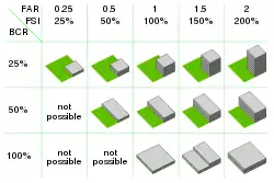 Comparison of floor area ratio (FAR) or floor space index (FSI) and building coverage ratio (BCR)