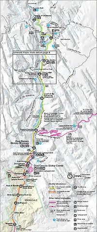 The Floor of the Valley Road, also known as the Zion Canyon Scenic Drive, follows the canyon of the North Fork of the Virgin River, also known as Zion Canyon, through Zion National Park, Utah, USA. A precursor to the present nine-mile road was first built in 1916, but was later redesigned by the National Park Service Branch of Plans and Designs to highlight the natural features of the valley while presenting a natural-appearing built environment. The road begins at the south boundary of the park and ends at the Temple of Sinawava.[2]