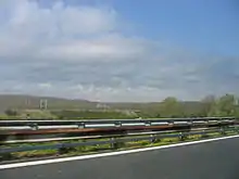 The rails are laid using a UIC 60 kilograms per metre (40 lb/ft) rail profile, with electrically welded rails attached to 2.30-metre-long (7.5 ft) prestressed reinforced concrete sleepers, spaced 60 centimetres (24 in) apart with Pandrol clips. The interconnections between the high-speed lines and the old Florence–Bologna lines are implemented through grade-separated crossings above or below the line rather than crossing over the opposing track on the level. The switches between the two running lines are capable of supporting speeds of up to 100 km/h (62 mph), while the 15 switches to connecting lines support speeds of up to 160 km/h (99 mph). The line is electrified at 3 kV DC, and supplied by substations at 16 kilometres (9.9 mi) intervals. A contract was let to Ansaldo STS to replace the signalling and train protection system with ETCS level 2 in October 2016. It is proposed to raise the maximum speed from 250 km/h (155 mph) to 270 or 280 km/h (168 or 174 mph).[2] It has been proposed to re-electrify the line at 25 kV AC in the past but this has been abandoned.