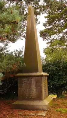 Florence Conybeare died at her father's home in 2 West Bolton Gardens, Kensington, London, on 29 February 1916, aged 43.[note 5] She left no issue. During the preceding 18 months, she had been in failing health, but no-one had anticipated her sudden demise from pneumonia. Her husband, Charles Conybeare, was unfortunately at Canterbury at the time.[13][15] Florence was cremated and a memorial service was held for her in London. She was buried in the cemetery of St Mary the Virgin Church, Fryerning, Ingatestone, Essex, and lies close to Charles Conybeare's parents. Charles Conybeare had a large obelisk-shaped memorial erected in her memory, which is mounted upon a square stone plinth,[note 6] and devised the following poignant inscription: