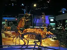 The entrance to the hall showcases six fossil shark jaws, ranging in height from 2–9 feet. The exhibition begins with five extinction events described in dioramas that lead visitors onto the Florida Platform at about 66 million years ago, also known as the Dawn of the Age of Mammals. Displays include a primitive-toothed whale in the Eocene, a pig-like, extinct mammal from the Oligocene, a Miocene rhinoceros being attacked by two saber-toothed, cat-like animals, a 15-foot (4.6 m)-tall sloth standing on its hind legs in the Pliocene area and a 500,000-year-old jaguar chasing a peccary from the Pleistocene epoch. The time periods also include artwork by paleoartists from around the world, including a 9-foot (2.7 m)-tall steel sculpture of an extinct Terror Bird, Titanis walleri.[9]
