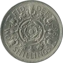 Florins were produced for Queen Elizabeth II each year between 1953 and 1967, with proof coins dated 1970. The obverse shows the Mary Gillick head of Queen Elizabeth, inscribed ELIZABETH II DEI GRATIA BRITT OMN REGINA[lower-alpha 11] (1953 only) or ELIZABETH II DEI GRATIA REGINA[lower-alpha 12] (all other years).[36] This change was made to acknowledge the evolving British Commonwealth, which by then contained some republics.[37] The reverse, by Edgar Fuller and Cecil Thomas, depicts a Tudor rose in the centre surrounded by thistles, shamrocks and leeks, with the Latin phrase FID DEF, the denomination and the date.[36] The designs were selected by the Royal Mint Advisory Committee following a public competition.[38] The artists' initials appear either side of the Welsh leek at the bottom of the reverse. When the reverse of the new coin was illustrated in the press, there was no consensus as to which way was up; numismatist H.W.A. Linecar has noted that the second L in SHILLINGS marks the bottom of the coin.[39]