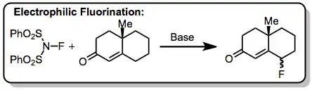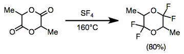Fluorination of lactones can provide heterocyclic fluorides, although ring opening has been observed for γ-butyrolactone. The six-membered lactide does not experience ring opening.[9]