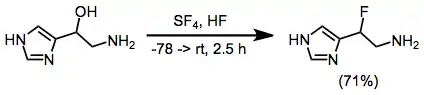 Sulfur tetrafluoride can be used to replace a variety of functional groups with partially or fully fluorinated derivatives. Liquid hydrogen fluoride can be used as a solvent and catalyst with SF4 to selectively fluorinate alcohols.[6] SF4's reactivity with carbonyl compounds is not enhanced in the presence of HF. Generally, only relatively acidic alcohols can be fluorinated efficiently with SF4, although amino alcohols appear to be an exception to this rule.