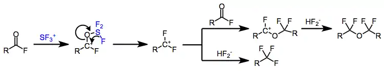 Fluorination of carboxylic acids gives not only the expected trifluoromethyl compounds, but also α-tetrafluorinated ethers. A mechanism to account for both products has been proposed and experimentally supported.[5] Intramolecular delivery of fluoride has been invoked to explain the formation of difluoromethyl cations. Attack of a molecule of acyl fluoride on a difluoromethyl cation, followed by neutralization with in situ generated bifluoride, leads to α-tetrafluorinated ether products. Direct reaction with bifluoride affords trifluoromethyl-containing products.
