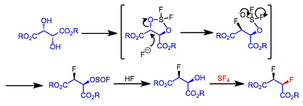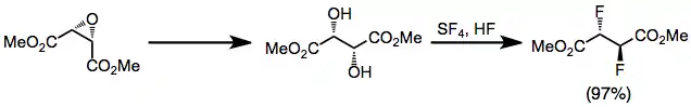 When vicinal diols are combined with SF4, difluorination occurs with inversion of configuration at one of the alcohols. This was demonstrated in the synthesis of meso-difluorosuccinate from (L)-tartrate and the synthesis of (D)- and (L)-difluorosuccinate from meso-tartrate.[7]