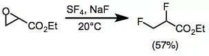 Fluorination opens epoxides to give either geminal or vicinal difluorides in most cases. Monoarylepoxides give geminal products with migration of the aryl group. Yields are low for sterically hindered di- and trisubstituted epoxides. Epoxides substituted with an ester group give vicinal difluorides via an alkoxysulfur trifluoride intermediate.[10]