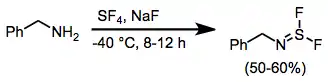 When amines are treated with SF4 and a base, iminosulfur difluorides result. Further reaction of these compounds with alkali metal fluorides leads to nitrile sulfides, which undergo [3+2] cycloaddition in the presence of dipolarophiles.[11]