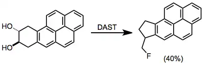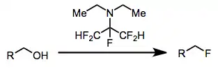 Fluorination with aminosulfuranes is a chemical reaction that transforms oxidized organic compounds into organofluorine compounds. Aminosulfuranes selectively exchange hydroxyl groups for fluorine, but are also capable of converting carbonyl groups, halides, silyl ethers, and other functionality into organofluorides.[1]