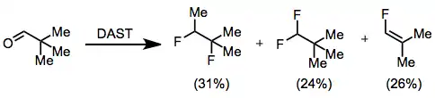 The polar mechanism of fluorination by DAST implies that certain substrates may suffer Wagner-Meerwein rearrangements. This process has been observed in the fluorination of pivalaldehyde, which affords a mixture of 1,2-difluoro-1,2-dimethylpropane, 1,1-difluoro-2,2-dimethylpropane, and 1-fluoro-2,2-dimethylethylene.[8]