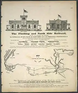 Before the Flushing and North Side, most of the line was originally built by the New York and Flushing Railroad (NY&F), in 1854 from Hunters Point in Long Island City to Flushing, before the LIRR opened its line to Long Island City.[1] Chartered on March 3, 1852, it was the first railroad on Long Island not to be part of the Long Island Rail Road. The company was taken over by Oliver Charlick and reorganized in 1859 as the New York and Flushing Railroad,[2] and established a subsidiary known as the "North Shore Railroad" to extend the line from Flushing to Great Neck in 1866 (see below). Originally intending to run further east to Roslyn, Oyster Bay, and even Huntington, the NY&F's plans were thwarted by the LIRR who reached those destination first, as well as poor service that the company became known for.