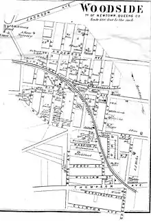Dissatisfied with the NY&F's service, residents of Flushing and Newtown convinced the LIRR to incorporate the Flushing and Woodside Railroad on February 24, 1864 as a competing branch to Flushing.[3][4] The branch ran from Woodside toward Great Neck Junction, with a branch to Whitestone. When the NY&F collapsed after construction of the Great Neck Extension, the LIRR acquired the railroad and left this branch unfinished. After Poppenhausen created the Flushing and North Side Railroad, he also acquired the Flushing and Woodside, but was able to complete construction of the line, which became the Woodside Branch of the Flushing and North Side. The line only contained one other station at Junction Boulevard and 35th Avenue called Grinnell station. This station opened on April 24, 1874 and closed in October 1877. East of Grinnell station and the Flushing River, there was a junction leading either toward the main line of the F&NS railroad or the Whitestone Branch.