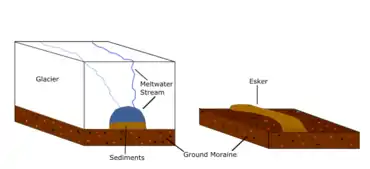 Eskers are long, curving ridges of stratified sediments found in previously glaciated regions. They may be several meters to hundreds of kilometers in length. The height and width of an esker are determined by the water and ice pressure and sediment load at the time of formation.[17] Eskers form in ice tunnels within or under a glacier, as shown in Figure 1, and are composed of the sediment deposits from the streams that occupy these tunnels.[18] Eskers may also form from supra-glacial streams that cut into the crevasses of the glacier. After the ice has melted away the stream deposits are left remaining as long mounded eskers. A system of subglacial streams may create a branched formation of eskers, although these are not often continuous branches.[17]