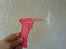 The fly gun (or flygun), a derivative of the flyswatter, uses a spring-loaded plastic projectile to mechanically "swat" flies. Mounted on the projectile is a perforated circular disk, which, according to advertising copy, "won't splat the fly". Several similar products are sold, mostly as toys or novelty items, although their supporters maintain that they work as well as traditional fly swatters.