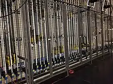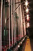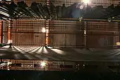 Electrical line sets, commonly called electrics, are used to suspend and control lighting instruments and, in many cases, microphones and special effects equipment as well. Electrics may be temporarily "wired" with drop boxes (electrical boxes with outlets) or multicable fanouts dropped from the grid or draped from a fly gallery, or permanently wired with connector strips (specialized electrical raceways).[2]