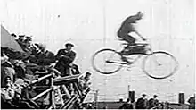 Flying the Foam and Some Fancy Diving is a 1906 British short silent comedy film, directed by James Williamson, featuring a man diving from Brighton Pier while mounted on a bicycle, in both forward and reverse motion. This trick film, according to Michael Brooke of BFI Screenonline, "adds additional layers of entertainment, firstly by showing the stunt from multiple angles (or rather several stunts, as the surrounding crowds differ from shot to shot) and then by showing it in reverse motion so that Reddish appears to be performing the impossible feat of riding his bicycle vertically out of the sea". It is believed to be an extended version of Professor Reddish Performing his Celebrated Bicycle Dive from Brighton West Pier (1902), supplemented by more conventional footage of pier divers at a later date.[1]