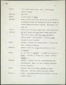 Despite reusing some scripts from other sources, Perrin said that he and Sheekman "had [their] hands full turning out a script each week".[17] They found help from Tom McKnight and George Oppenheimer, whose names were passed along to Groucho. Perrin explained, "[Groucho] was in the men's room during a break, and he was complaining to the guy standing next to him, 'Geez, I wish we could find another writer or two to make life easier.' Suddenly there's a voice from one of the stalls: 'I've got just the guys for you!' Having Tom and George did make life easier, although Arthur and I went over their scripts for a light polishing."[17]