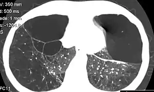 A focal lung pneumatosis, is an enclosed pocket of air or gas in the lung and includes blebs, bullae, pulmonary cysts, and lung cavities. Blebs and bullae can be classified by their wall thickness.[1]