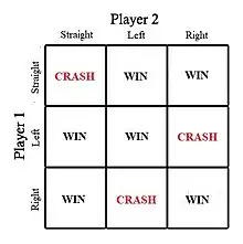 This idea of anti-coordination game is also apparent in the game of chicken, which involves two cars racing toward each other on a collision course and in which the driver who first decides to swerve is seen as a coward, while no driver swerving results in a fatal collision for both.