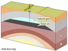 Anticlinal traps are formed by folding of rock. For example, if a porous sandstone unit covered with low permeability shale is folded into an anticline, it may contain hydrocarbons trapped in the crest of the fold. Most anticlinal traps are created as a result of sideways pressure, folding the layers of rock, but can also occur from sediments being compacted.[23]