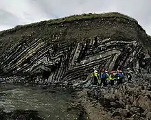 Slump folding: When slumps form in poorly consolidated sediments, they commonly undergo folding, particularly at their leading edges, during their emplacement. The asymmetry of the slump folds can be used to determine paleoslope directions in sequences of sedimentary rocks.[15]