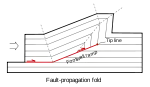Fault propagation folds or tip-line folds are caused when displacement occurs on an existing fault without further propagation. In both reverse and normal faults this leads to folding of the overlying sequence, often in the form of a monocline.[12]