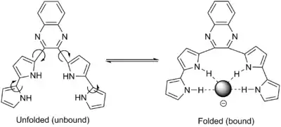 Abiotic foldamers are again organic molecules designed to exhibit dynamic folding. They exploit one or a few known key intermolecular interactions, as optimized by their design. One example is oligopyrroles that organize upon binding anions like chloride through hydrogen bonding (see figure). Folding is induced in the presence of an anion: the polypyrrole groups have little conformational restriction otherwise.[17][18]