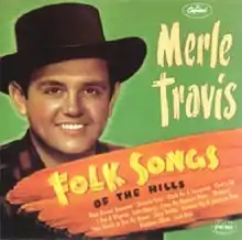 In 1944, Merle Travis moved to Hollywood, California, where he made a living by performing minor roles in Western films and playing with Ray Whitley's Western Swing Band.[3] At the time, Capitol A & R man and producer Lee Gillette was looking for a way to enter the rising market for traditional American folk music created by singers and musicians such as John Jacob Niles, Burl Ives, Josh White, Woody Guthrie, Lead Belly, and The Golden Gate Quartet. Travis was known for his broad repertoire of country standards and outstanding guitar playing. Gillette signed him to a recording contract in 1946 and asked him to record a series of folk and folk-inspired songs accompanying himself on an acoustic guitar (although he usually played a hollow-body electric). The recordings that resulted, taking place at two dates in August 1946,[4] led to the eight titles that appeared in the original 78 rpm version of Folk Songs of the Hills, one of the earliest examples of a concept album. Though a commercial flop at the time, the album was widely admired by musicians, and Travis was invited to preserve some of his performances in a series of Snader Transcriptions, an early form of music video, which can be viewed today on several internet sites and DVDs.[5] In 1955, one song from the album, "Sixteen Tons", was recorded by Tennessee Ernie Ford and became a million-selling crossover hit. A number of other songs from the album, such as "Dark as a Dungeon" and his arrangement of "Nine-pound Hammer," entered Travis's regular repertoire and are considered standards.