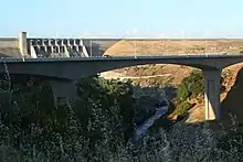 Folsom Dam is located just north of the city of Folsom, and consists of a 340-ft-high (100 m), 1,400-ft-long (430 m), hollow-core, concrete gravity dam containing 1,170,000 cu yd (890,000 m3) of material.[2] The dam is flanked by two earthen wing dikes, and the reservoir is held in place by an additional nine saddle dams on the west and southeast sides.[10] The wing dams total a length of 8,800 ft (2,700 m),[11][12] and the saddle dams measure 16,530 ft (5,040 m) long combined.[n 1] The dam and appurtenant dikes total a length of 26,730 ft (8,150 m), more than 5 mi (8.0 km). Floodwaters are released by a spillway located on the main channel dam, controlled by eight radial gates with a capacity of 567,000 cu ft/s (16,100 m3/s), as well as a set of outlet works with a capacity of 115,000 cu ft/s (3,300 m3/s).[5]