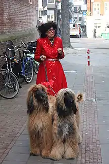 The materials Fong Leng uses for her creations are leather, suede, silk, marabou feathers, and fur. She uses techniques like application, incrustation, quilting, matelassé, smocking and pleating. Most designs have figurative images on them. Fong Leng is most famous by her cloak dresses for women. High society and extravagant women like Mathilde Willink and Kate Bush wore clothes by Fong Leng. The cloak dresses were given names such as Straalmantel (Radius Cloak), Nijinski, Paradijsvogel (Paradise Bird), and Luipaardmantel (Leopard Cloak) (see picture).[4]