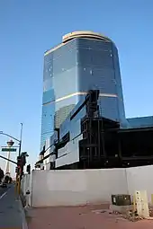 A large crane, used for constructing the hotel tower, was eventually dismantled in May 2014. The crane, like the unfinished resort, was considered an eyesore and a reminder of the Great Recession.[105][113] Rusted, lower-floor portions of the unfinished resort were located along the sidewalk on Las Vegas Boulevard, presenting a poor appearance for the area. In 2015, Icahn agreed to county requests for an exterior upgrade, which would help improve the project's appearance. A cosmetic wrap, consisting of fabric and paint, would cover the unfinished portions, similar to the stalled St. Regis tower, also on the Las Vegas Strip.[114] The blue-and-white wrap was eventually added in 2017.[115][116]